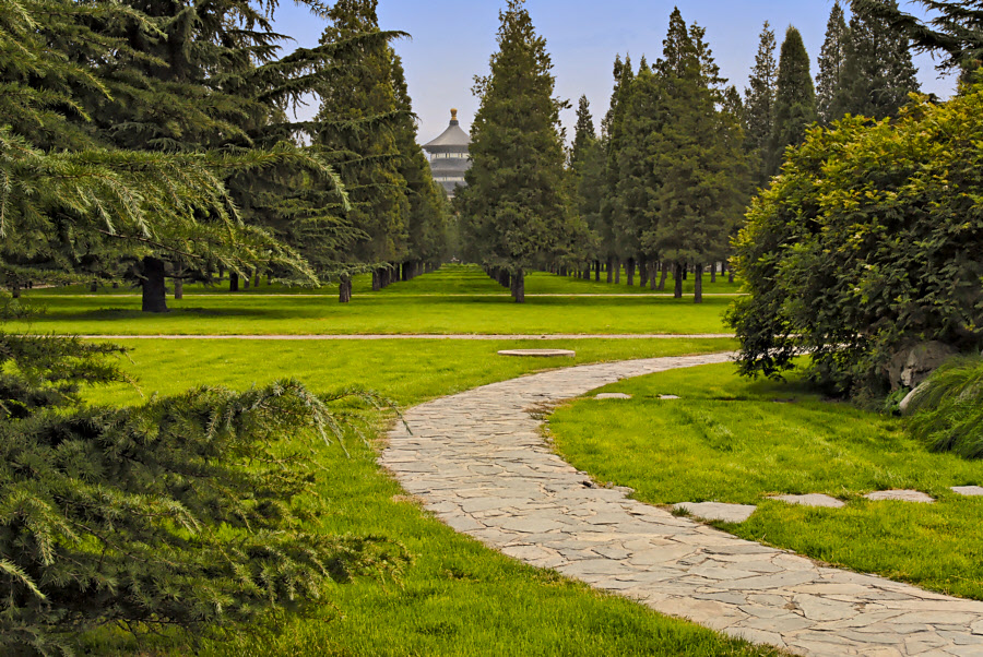 Это «тропинка» из более светлых плит на южной дороге к лестнице Императорского Небосвода. Подойдите к металлической ограде вокруг мраморной плиты с драконами. Видите прямо под ногами на плитке – иероглифы? Это написано название «Камней тройного эха». Первый - даже иероглифом то не воспринимается – три горизонтальные черты. Но это так китайцы пишут число «три». Под вашими ногами первая плита, я позади – вторая, третья. Хлопните в ладоши на первой плите – и эхо будет одно, на второй – два, на третей – три.