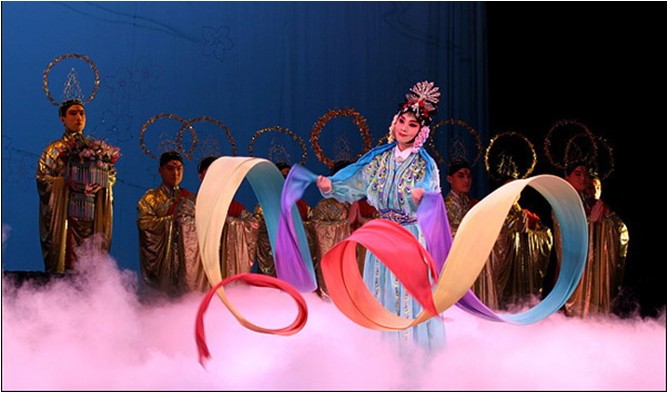 Длинные шелковые рукава женских сценических костюмов называются шуйсюй (水袖 shuixiu) – движения – «игра» ими - помогают актеру в создании психологической окраски образа.