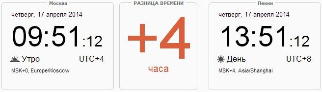 Который час, сколько времени сейчас в Пекине, Китай? Разница во времени между Москвой и Пекином составляет четыре часа с опережением Поднебесной. То есть, если у нас сейчас еще только 10.00 утра, то часы в Пекине уже показывают текущее местное время 14.00. Часовой пояс столицы Китая - UTC+8, Asia/Shanghai.