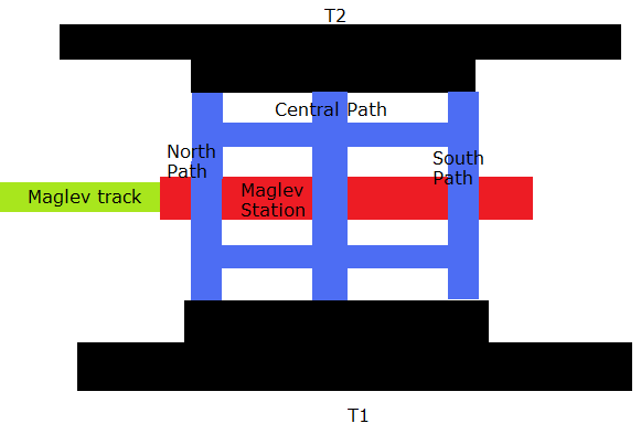 Между ними располагается станция скоростного поезда Маглев.
