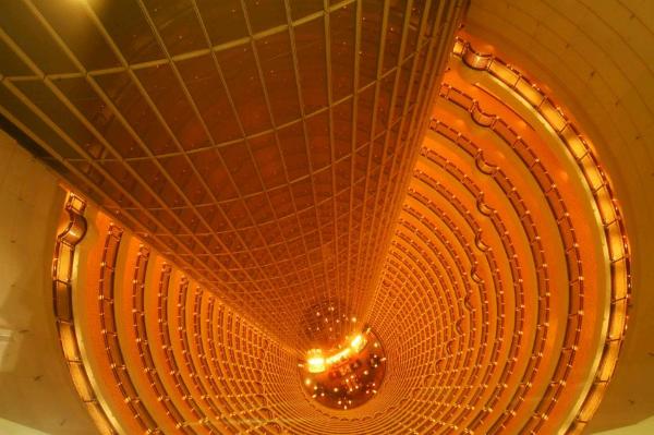 Заказывайте(вместо билета) коктейль, кофе и любуйтесь видом Шанхая. Интересно заглянуть в гигантский колодец-пропасть этажей этого отеля: